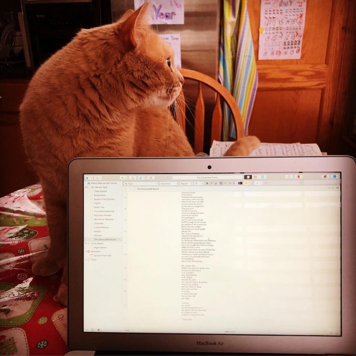It’s raining. It’s pouring. My tabby cat is keeping track of my word