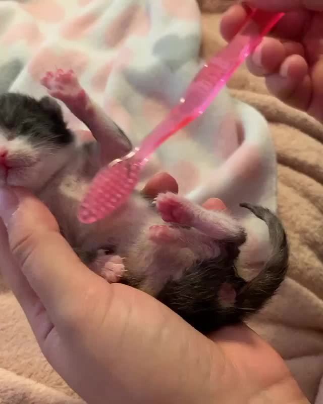 Goooood morning! &;&; A toothbrush feels like a mother cat’s tongue, providing comfort and cleaning them! Simulating this for the kittens will not only help teach them to groom themselves in the future, but provide comfort and affection. Can you tell by the purrs that Luna is enjoying this? &; And yes, she did have the hiccups! Totally normal and she’s completely fine!