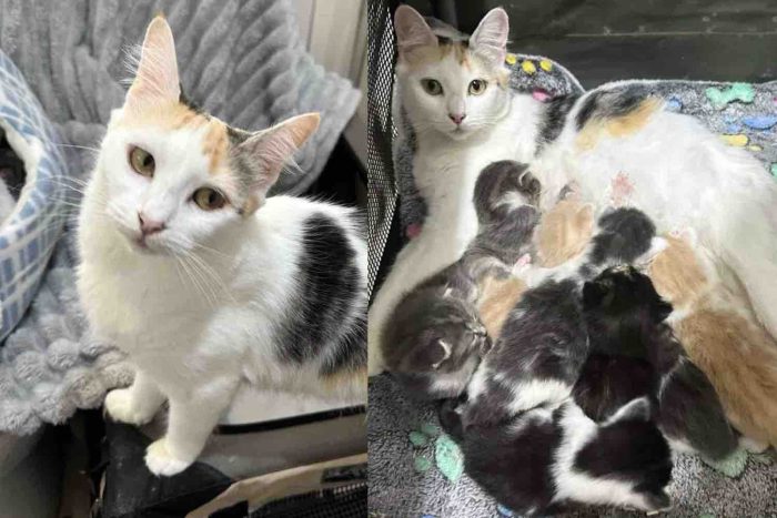 Kind people stepped in to help a shelter cat who needed a place to land. She arrived with eight tiny kittens by her side.