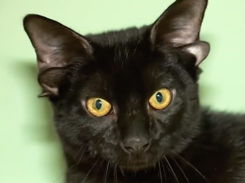Meet Dobby a 7 month old black kitten who was born with a rare genetic mutation causing a curled tail, under bite and four “ears”!