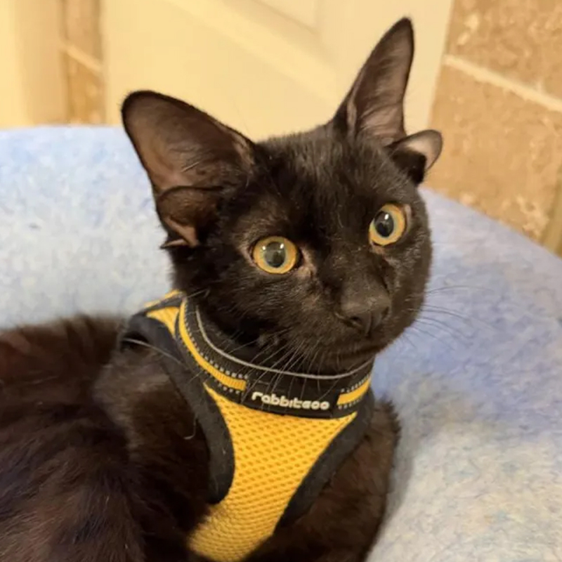 Dobby is being fostered by Stephanie Brown a board member of Kitty Kat Haven and Rescue in Alabama. Stephanie has lots of experience fostering cats with unique conditions. That includes her own kitty Phoebe who lives with cerebellar hypoplasia (CH), or also known as wobbly kitten syndrome. Stephanie first learned about Dobby through a Facebook post from his previous owner. They were looking to rehome him after months of unsuccessful attempts to help him adjust to the resident senior cat in the household. Brown has fostered over 100 cats and jumped at the chance to foster this lucky black cat!
